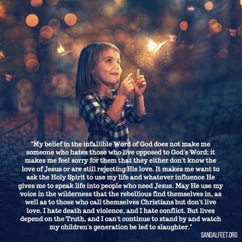My belief in the infallible Word of God does not make me someone who hates those who live opposed to God's Word; it makes me feel sorry for them that they either don't know the love of Jesus or are still rejecting His love. It makes me want to ask the Holy Spirit to use my life and whatever influence He gives me to speak life into people who need Jesus. May He use my voice in the wilderness that the rebellious find themselves in, as well as to those who call themselves Christians but don't live love. I hate death and violence, and I hate conflict. But lives depend on the Truth, and I can't continue to stand by and watch my children's generation be led to slaughter.